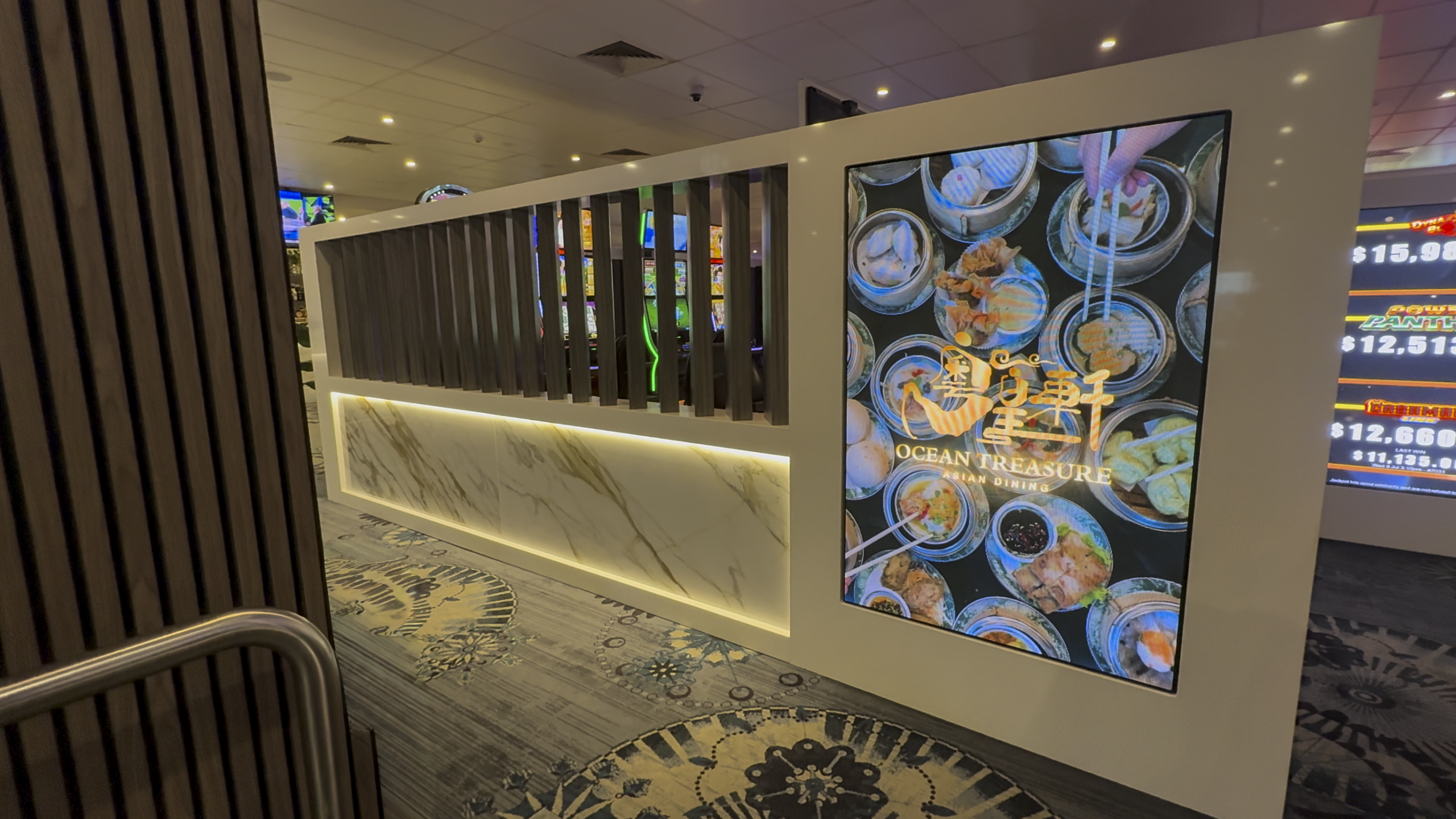 The indoor LED displays provide clear, flexible content for promotions and gaming, while the custom L-shaped outdoor banner creates a memorable experience for patrons.